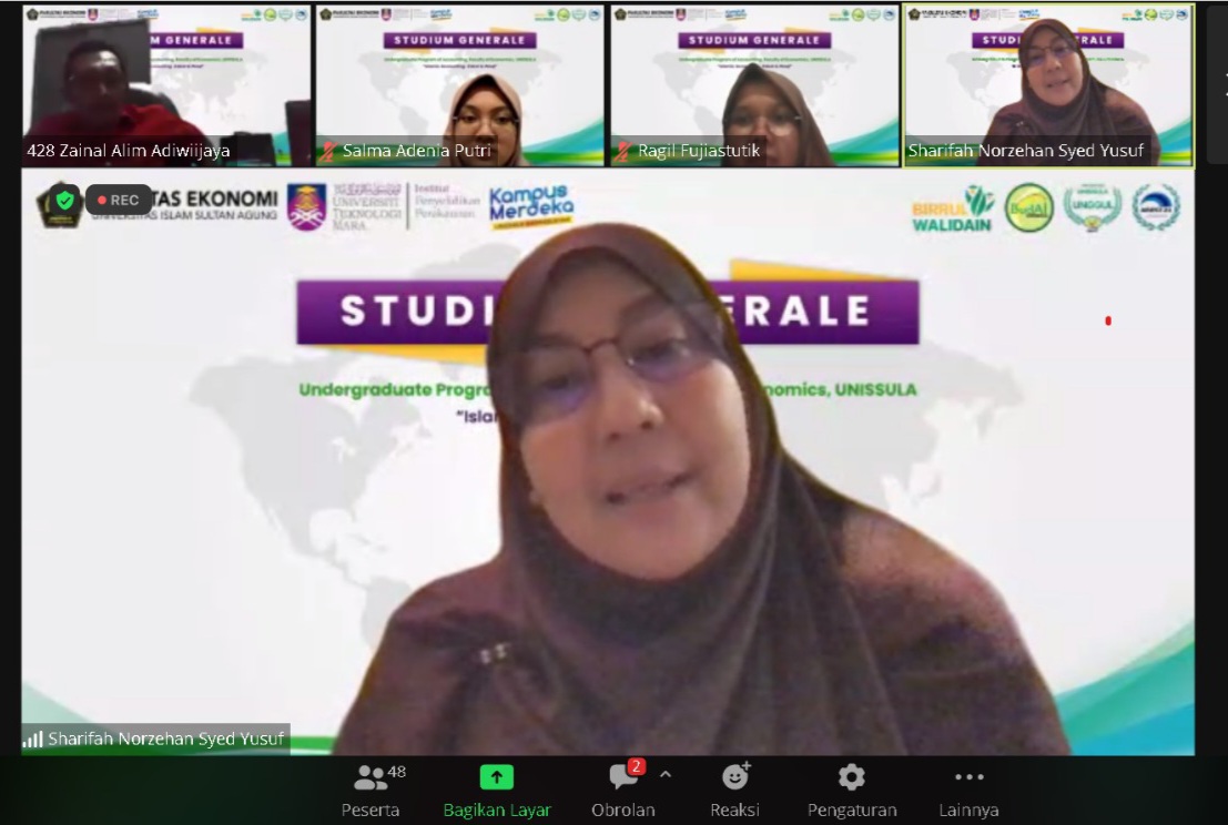 Program Studi S1 Akuntansi FE Unissula menyelenggarakan stadium general. Hadir sebagai pemateri Assoc Prof Dr Sharifah Norzehan Syed Yusuf dan Assoc Prof Dr Zaenal Alim Adiwijaya SE MSi Ak CA. Keduanya membahas tentang zakat dan wakaf dalam akuntansi Islam yang berlangsung secara daring, Jum’at (8/9/2023). Diskusi dihadiri oleh mahasiswa Akuntansi dan mahasiswa FE Unissula secara umum.