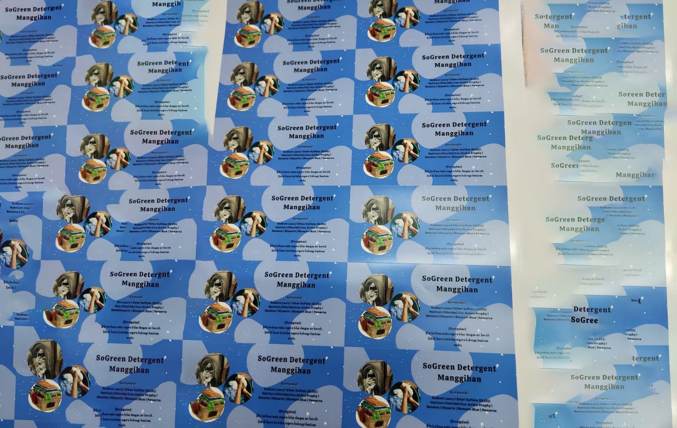 Selain didmpingi dalam hal proses produksi, mereka juga dilatih membuat packaging dan pembuatan label nama produk yang ditempekan di botol-botol sabun.