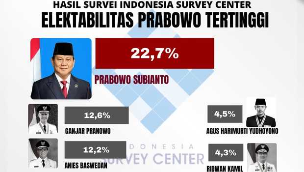 Dalam survei itu, elektabilitas Prabowo mencapai 19,0%. Sementara nama Ganjar Pranowo meraih 15,2%; Anies Baswedan 14,1%; AHY 5,0%; Ridwan Kamil 4,0%; dan Sandiaga Uno 2,4%.